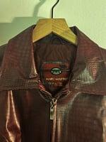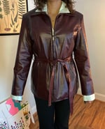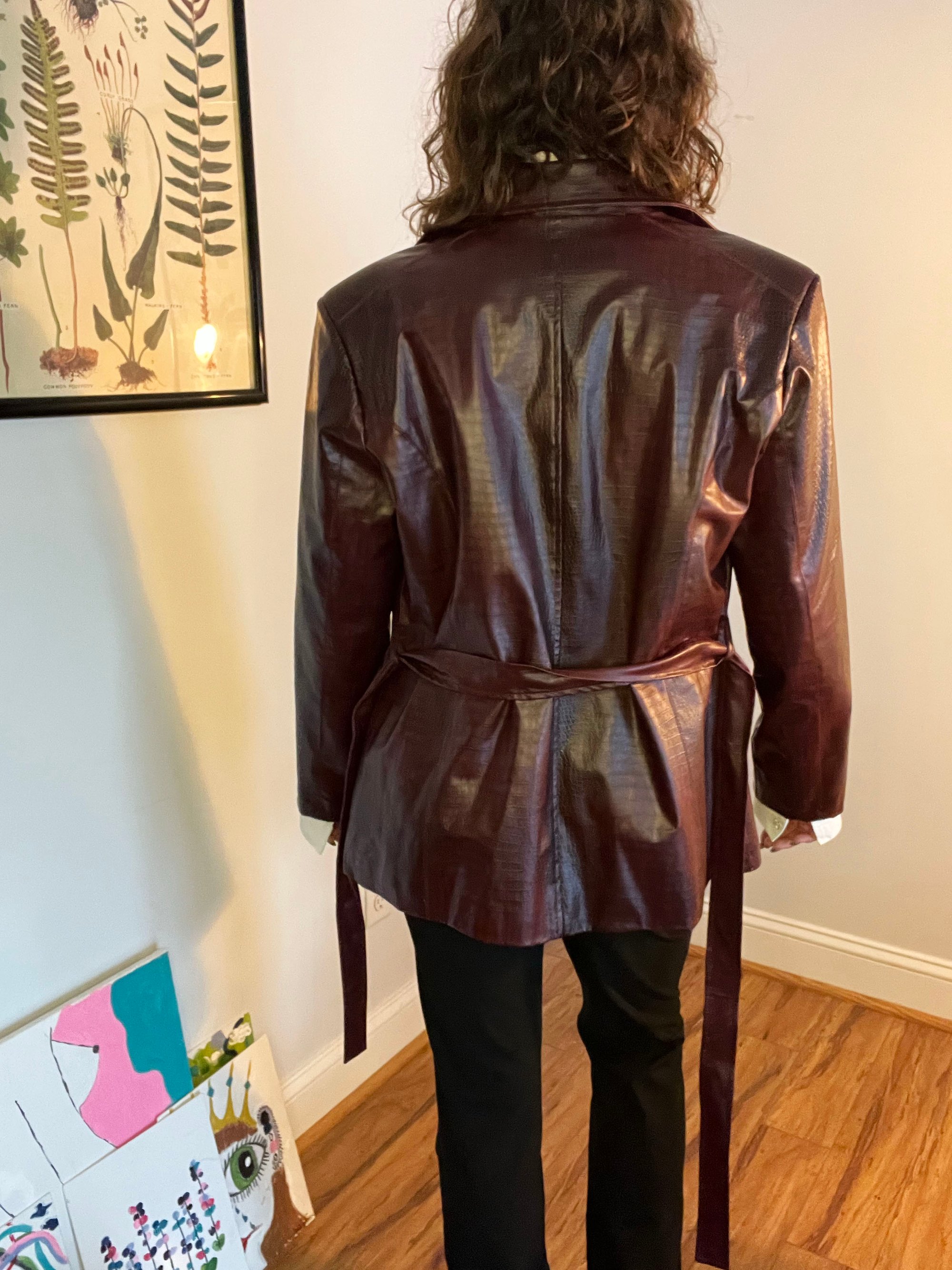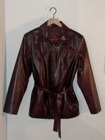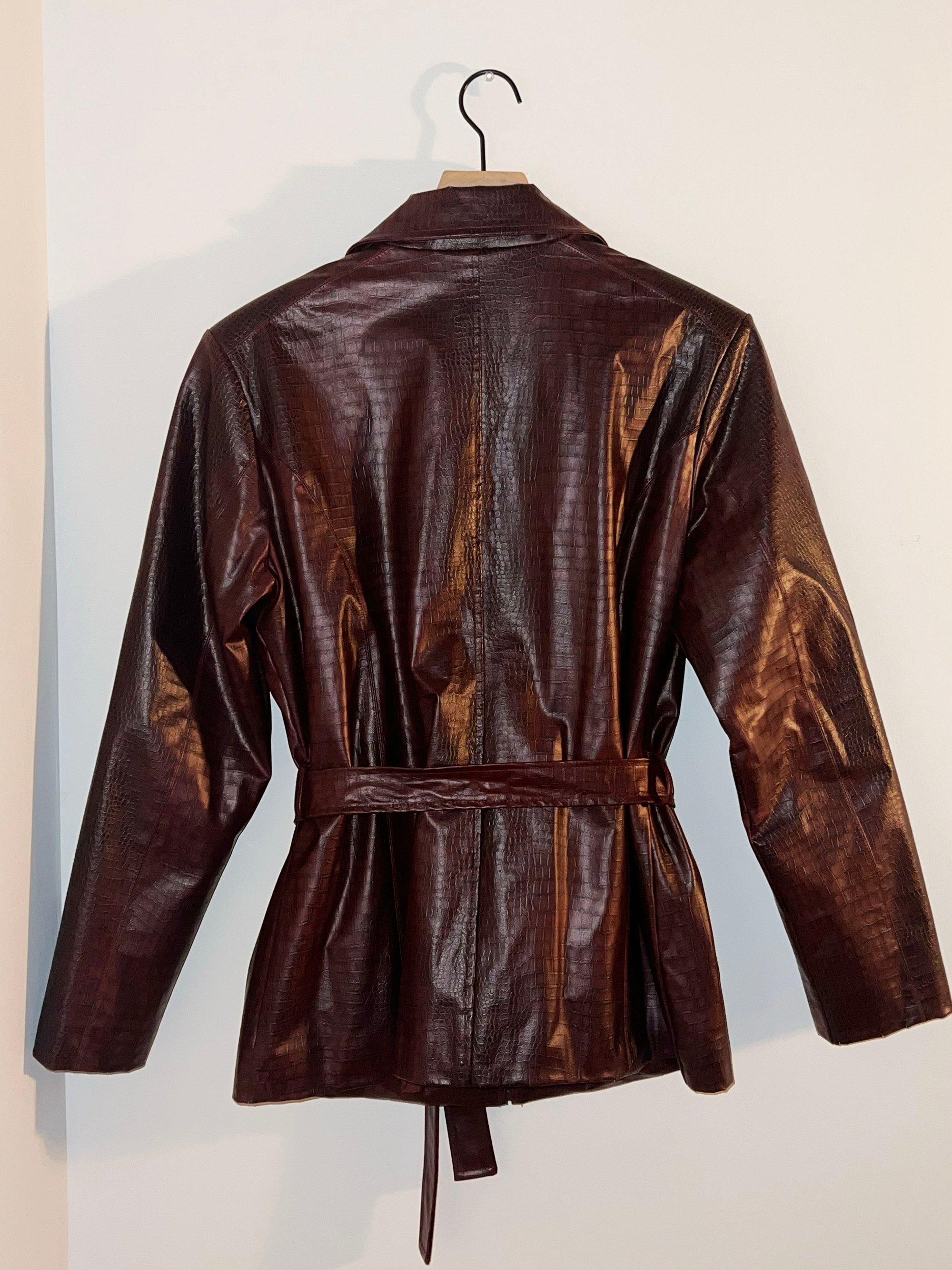 Command attention with this bold Burgundy Pleather Jacket. This jacket combines edgy attitude with a sleek, modern silhouette. The rich burgundy hue adds a touch of sophistication, making it the perfect statement piece for any wardrobe. Zips up, with tie around belt.